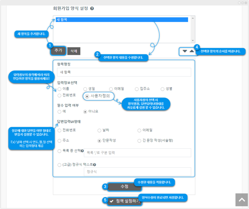 정책관리 – 회원가입 양식을 설정하는 방법을 알려드립니다.