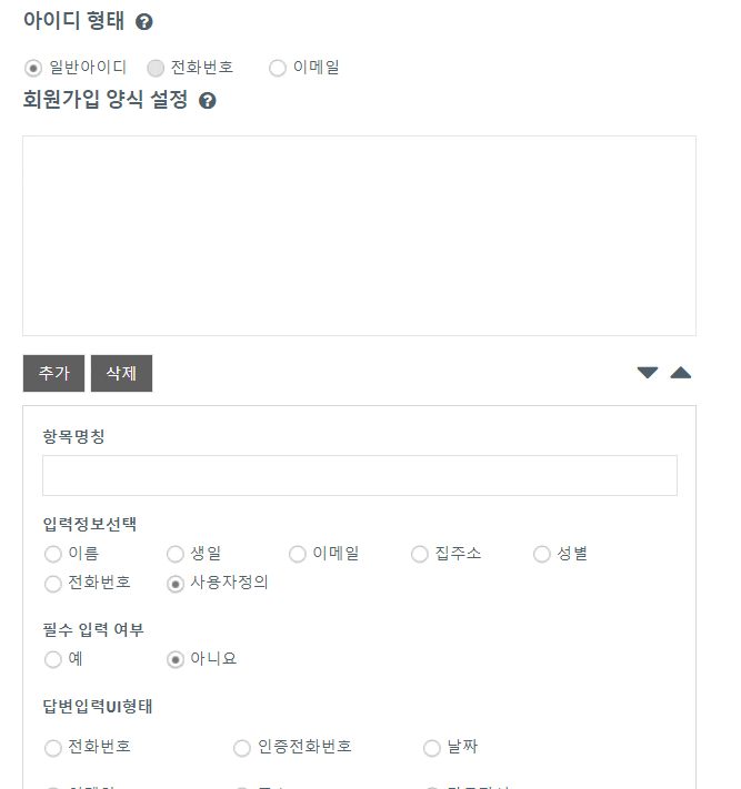 1)아이디 형태: 이메일, 일반아이디 형태 중 한 가지를 선택한 뒤