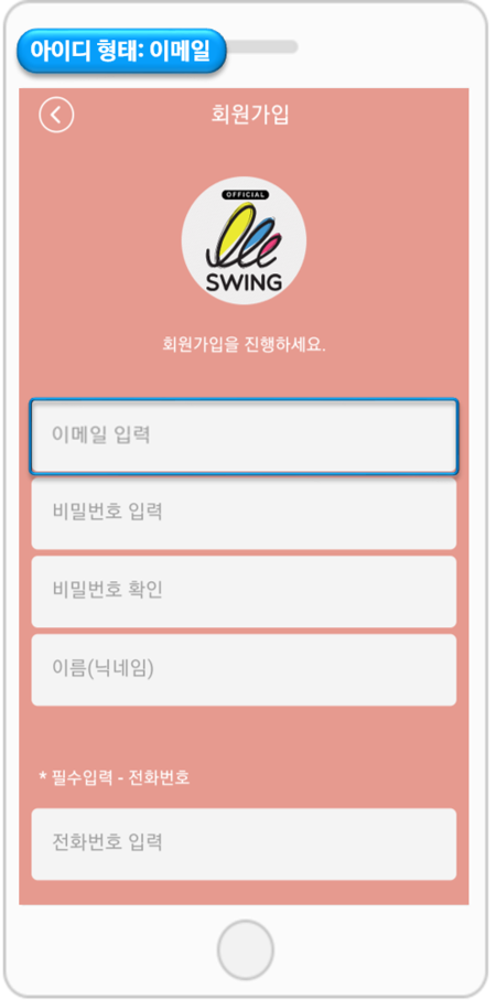 회원가입 항목을 설정하지 않아도, 스윙투앱에서는 기본 항목을 고정값으로 제공하는데요.