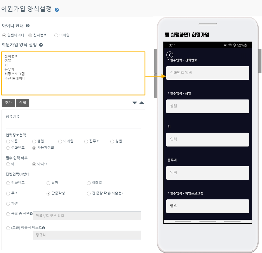 이 외에 관리자가 앱 사용자들에게 추가로 받고 싶은 정보가 있다면 회원가입양식에서 항목을 추가로 입력해서 설정할 수 있습니다.