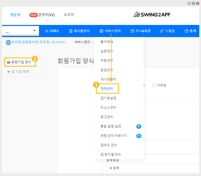 앱운영→ 서비스관리 → 정책관리 → 회원가입 양식 메뉴로 이동합니다.