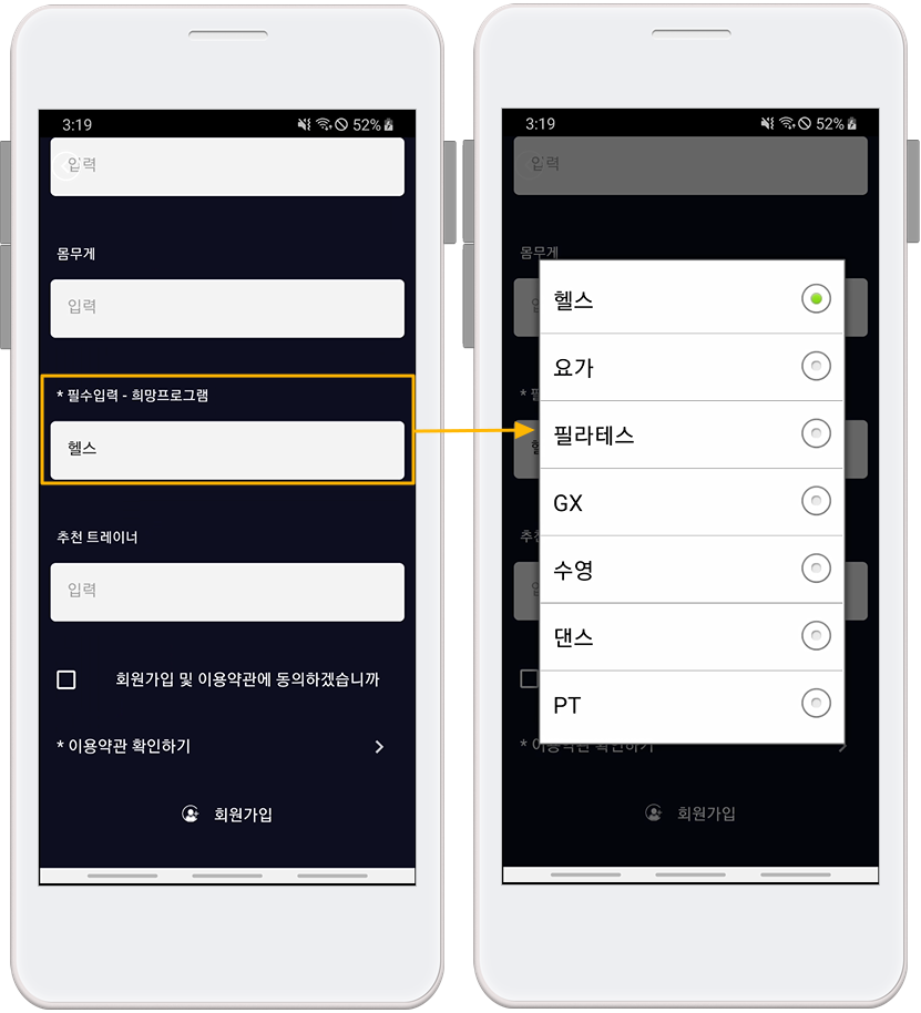스윙투앱 헬스클럽의 회원가입양식 입력예시와 앱 적용 화면입니다.