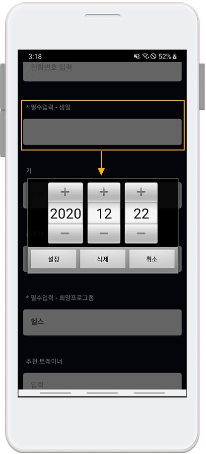★ 입력정보 : 전화번호, 생일, 키(단문작성), 몸무게(단문작성), 희망프로그램(헬스,GX,요가,필라테스,댄스),운동목표(긴문장작성/서술형)