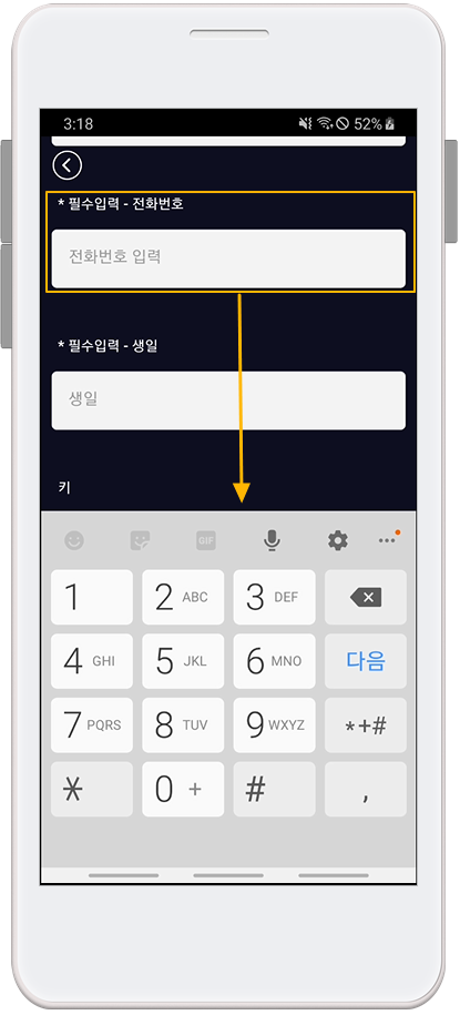아이디 형태에 따라 앱실행화면- 회원가입 화면이 어떻게 다른지 확인해볼게요.