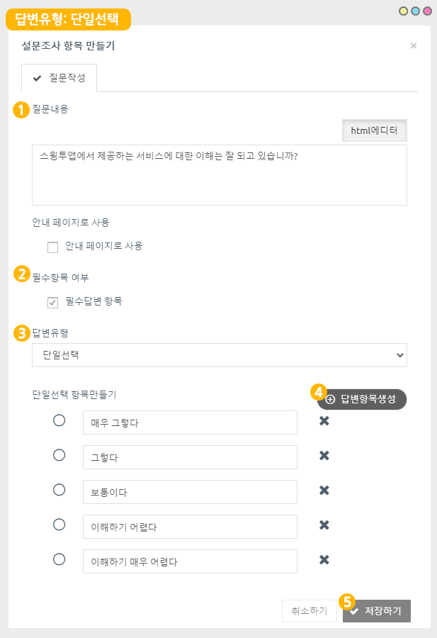 4) 답변유형: 답변유형은 사용자들이 답변을 고를 때 하나만 선택가능한 단일 선택인지,