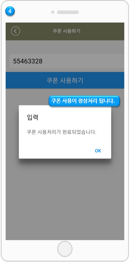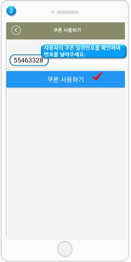 관리자는 앱을 실행하여서 사용자의 쿠폰 일련번호를 입력만 하면 그 자리에서 바로 쿠폰 사용처리를 완료할 수 있습니다!!
