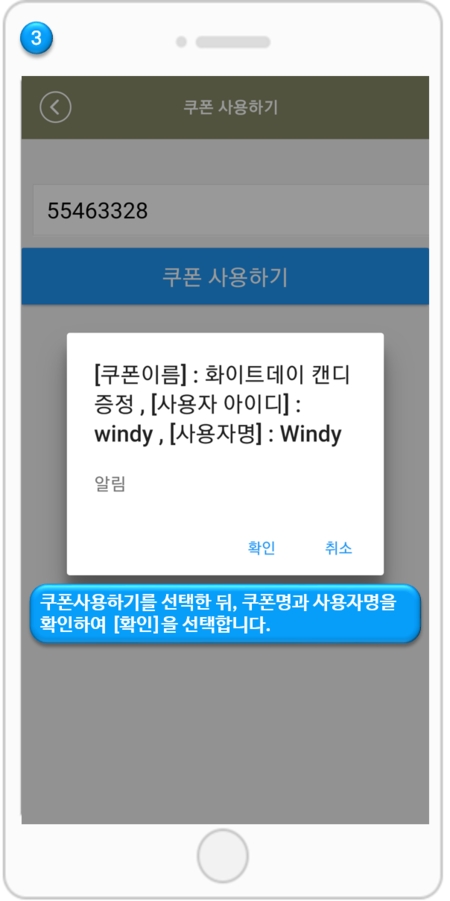 쿠폰이름, 사용자 아이디, 사용자명이 기재된 메시지창이 뜹니다.