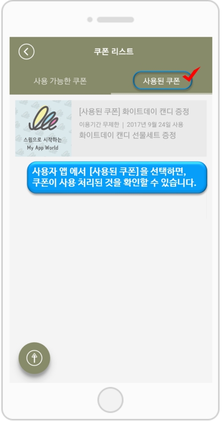 이상으로 앱 관리자메뉴에서 관리자가 사용자의 쿠폰을 사용처리하는 과정을 보여드렸는데요.