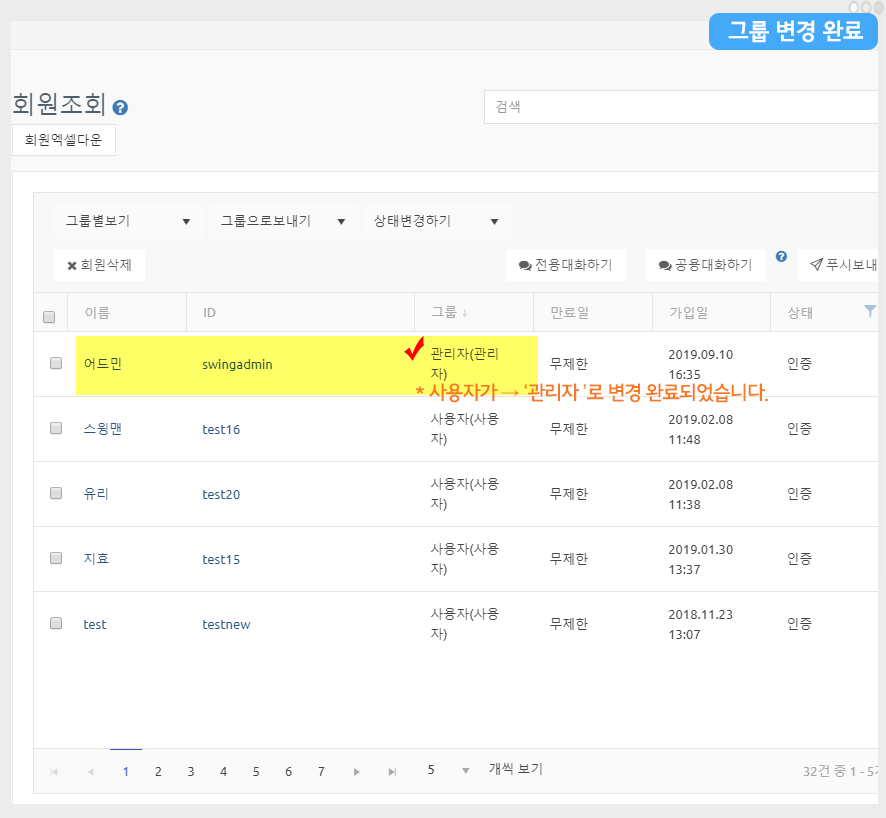 앞서 사용자였던 회원이 ‘관리자’로 변경이 됩니다.