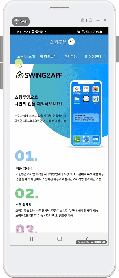 *스윙투앱 프로토타입- 푸시, 웹뷰로 제작한 앱은 앱미리보기가 불가능합니다.(앱 다운로드만 가능)