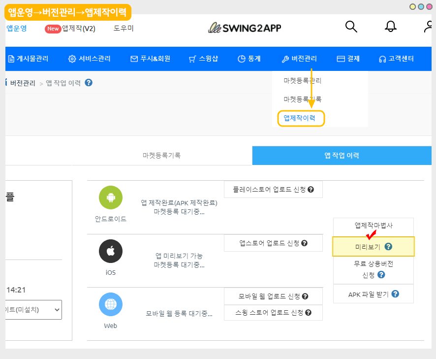 *스윙투앱 앱운영페이지 → 버전관리 → 앱제작 이력 페이지로 이동합니다.