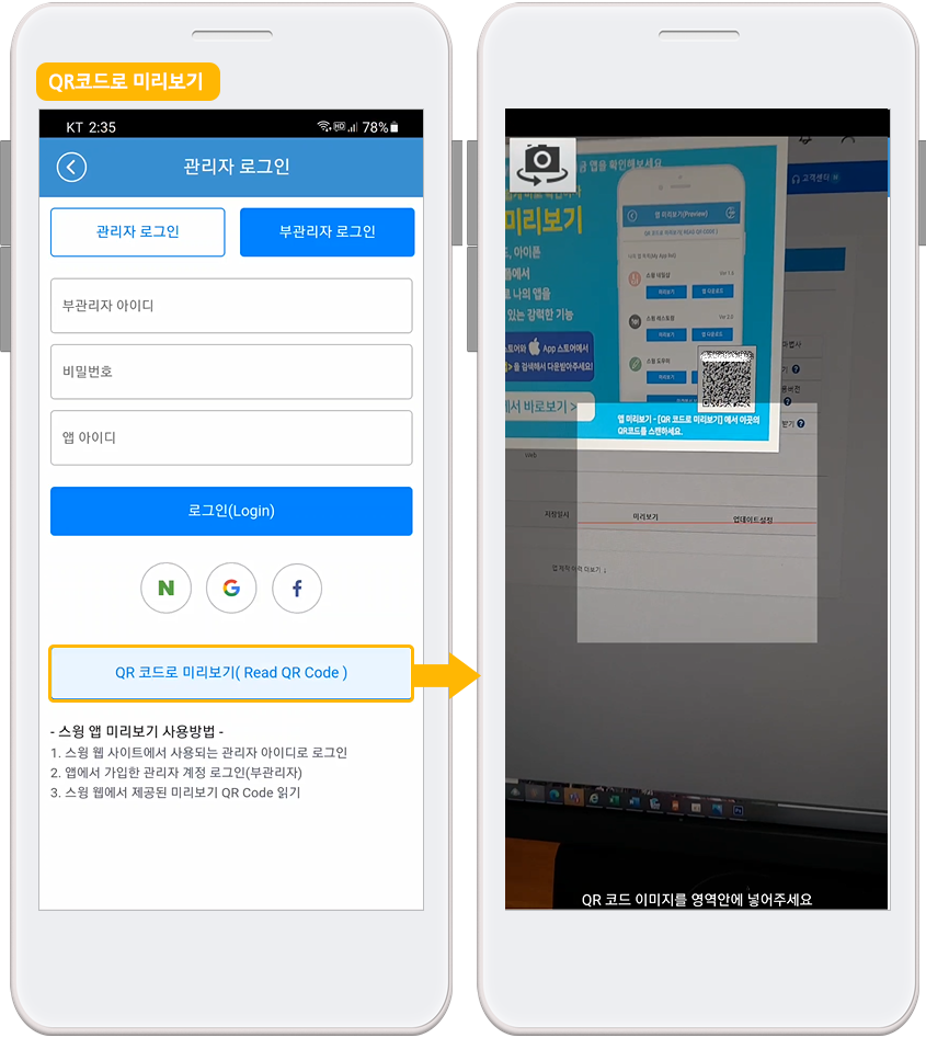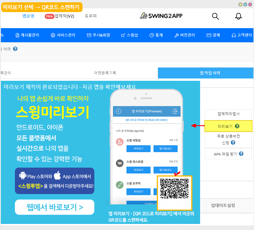 스윙 앱미리보기는 관리자 로그인 외에, QR코드로 찍어서도 앱을 미리보기로 확인할 수 있어요
