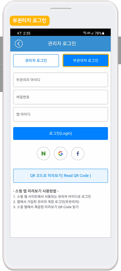 간편로그인 사용자는 안드로이드폰을 이용하시거나, 아이폰 이용시 부관리자 로그인 or QR코드로 미리보기 기능으로 이용해주세요.
