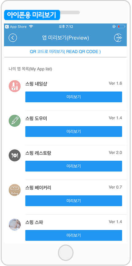 아이폰은 앱 다운이 안되기 때문에 [미리보기] 버튼을 통해서 제작한 앱을 미리보기로 확인 할 수 있습니다.