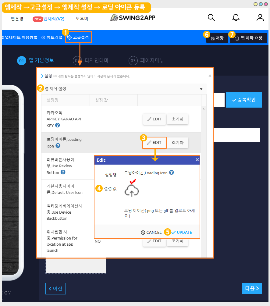 2) [앱제작 설정]에 보시면 로딩아이콘 메뉴가 있습니다.