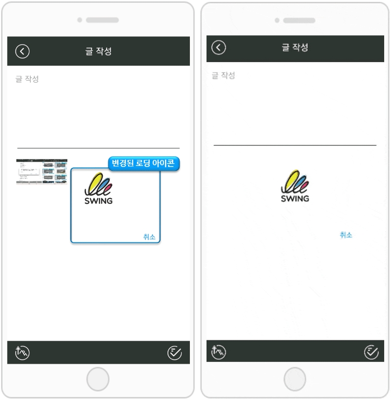 로딩 아이콘은 서버에서 자동으로 불러오는 기능이기 때문에 스윙 사용자분들이 특별히 작업하셔야 할 내용은 없어요. 위의 이미지처럼 기본 로딩 아이콘이 제공됩니다~^^ 그러나 로딩 아이콘 이미지를 좀 더 앱 스타일에 맞게 수정하고 싶으실 때가 있죠. 따라서 매뉴얼을 통해서 기존의 로딩 아이콘 외에 다른 이미지를 넣어서 로딩 아이콘을 변경하는 방법을 알려드릴게요!!