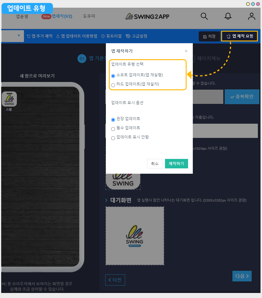 [앱제작요청]을 누르면 업데이트 유형, 업데이트 표시옵션 항목을 사용자가 정해서 이용할 수 있습니다.