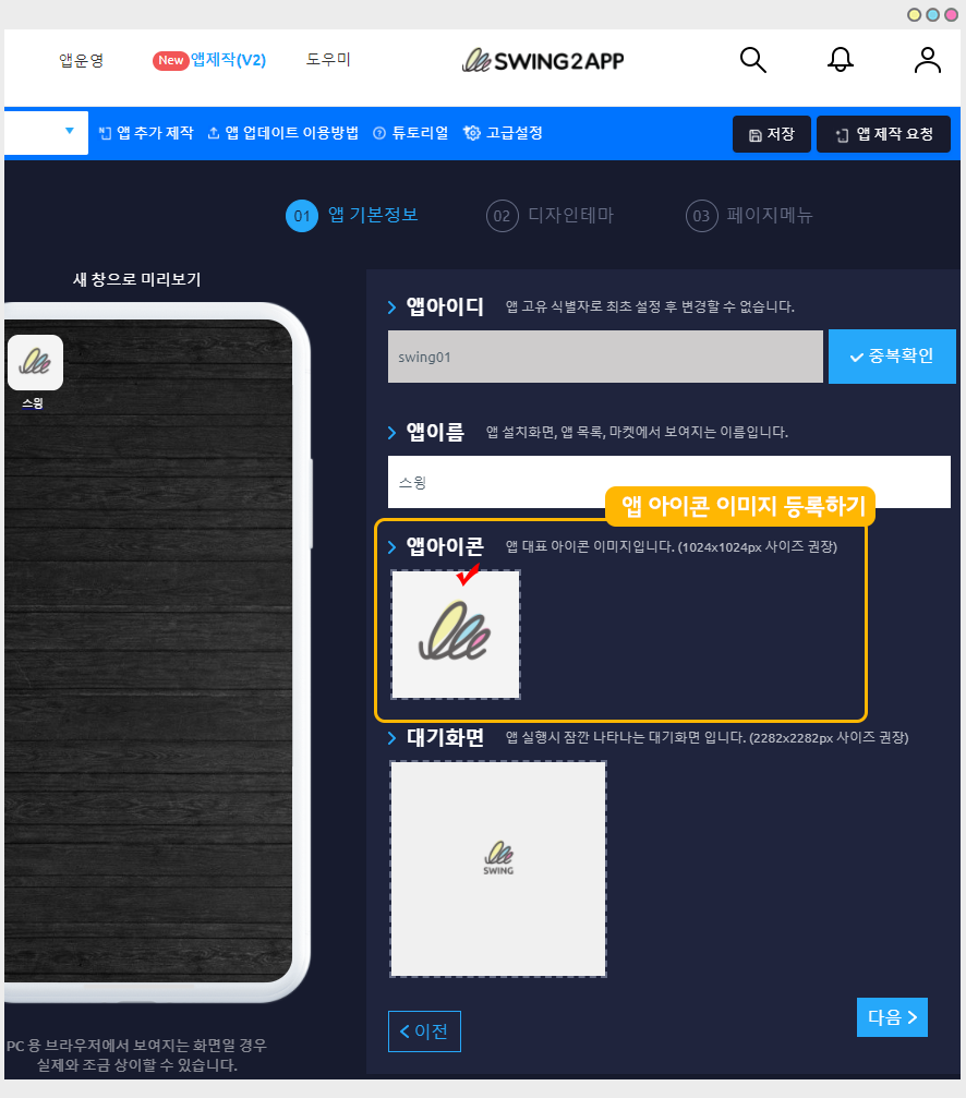 스윙투앱 앱제작은 추가적으로 계속해서 수정이 가능하니 샘플로 한 번 적용해보시고 다른 이미지로 수정해주셔도 됩니다.