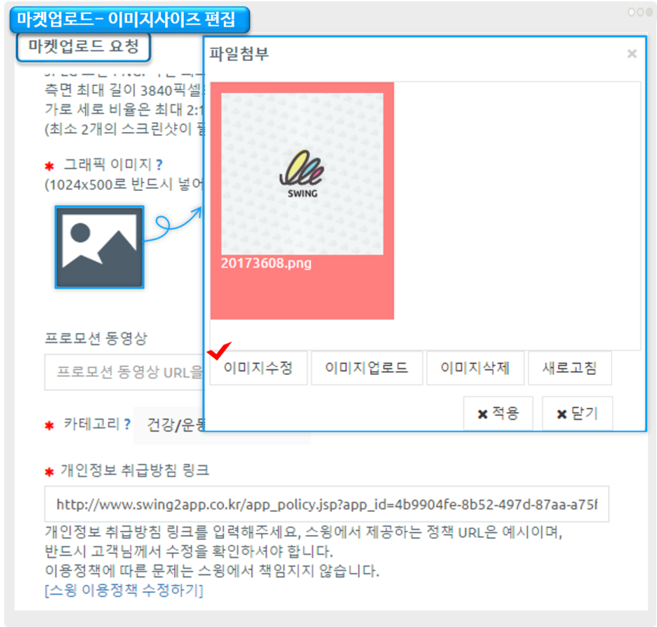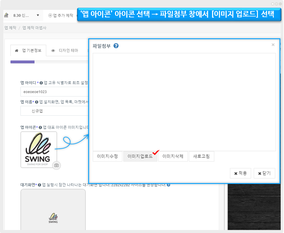 이때 이미지 사이즈는 스윙에서 제공하는 규격 사이즈에 맞춰서 넣어주셔야 업로드가 됩니다.