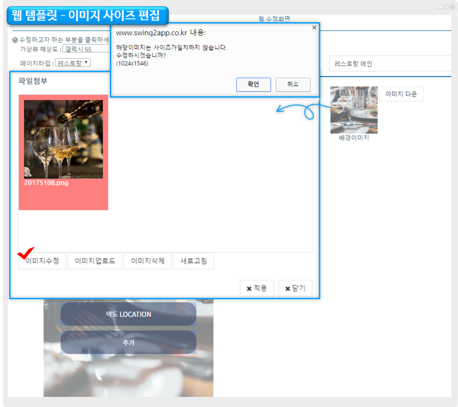 템플릿 페이지 이용방법 [앱제작 페이지 -페이지메뉴-사용자페이지 불러오기- 템플릿 페이지 제작도구 이동- 템플릿 선택] 템플릿페이지를 선택 한 뒤 이미지를 첨부하는 버튼을 선택해주세요. (위의 이미지는 레스토랑 템플릿의 – 배경이미지를 선택했습니다.) 해당 템플릿의 배경이미지 사이즈는 1024×1546 인데요. 사이즈가 맞지 않는 이미지를 업로드하자 “해당 이미지는 사이즈가 일치하지 않습니다. 수정하시겠습니까”라는 메시지창이 떠요. ‘확인’을 선택하면 바로 이미지편집도구로 이동합니다.