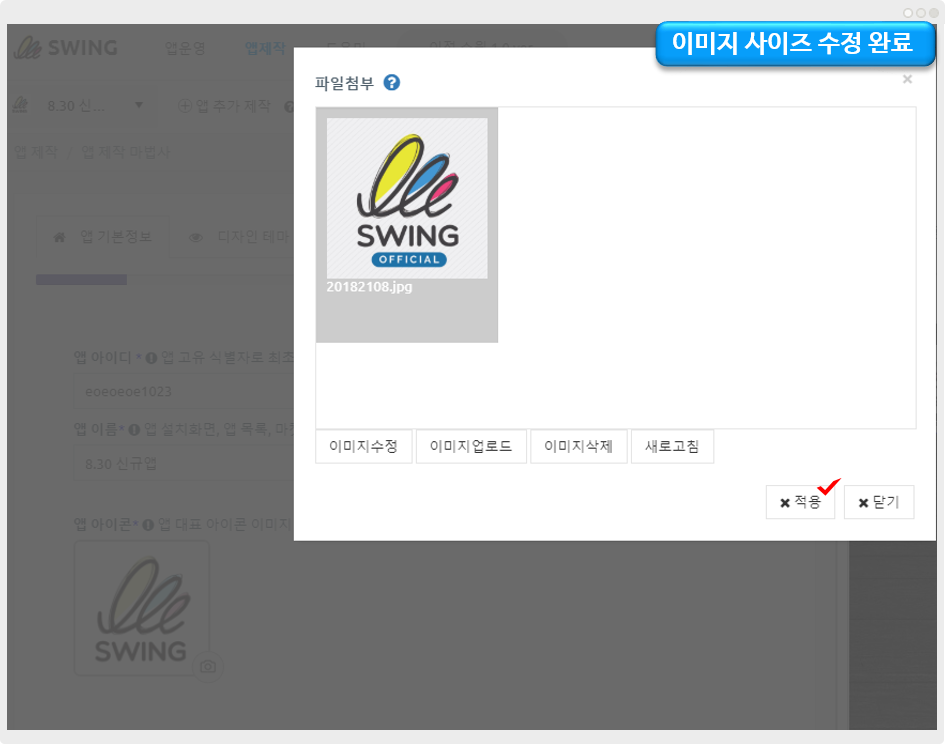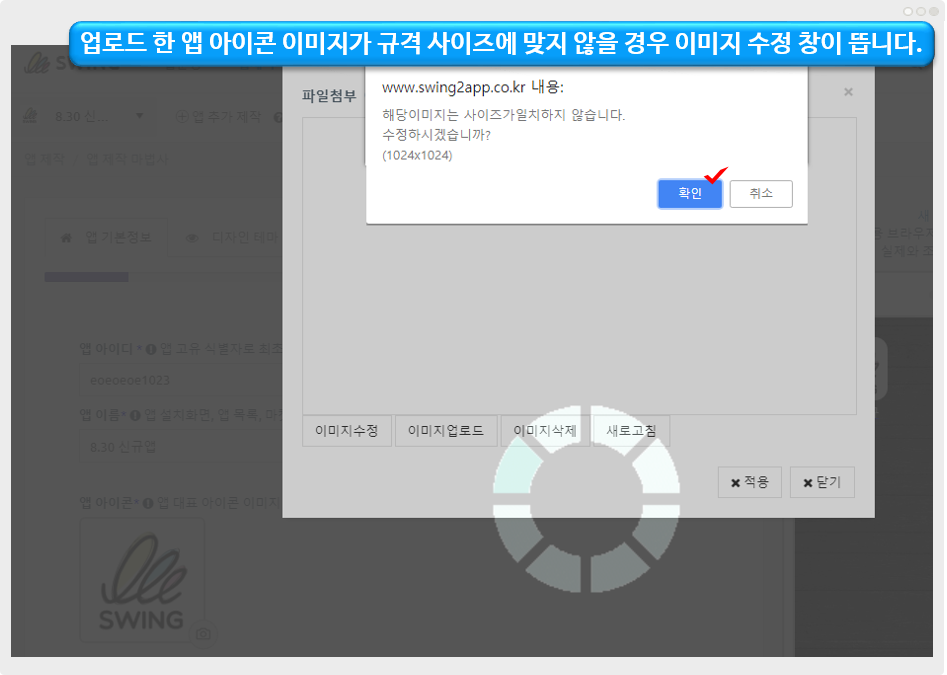 앱제작시 업로드하고자 하는 이미지 사이즈가 제작방법에서 기재해놓은 권장 이미지 사이즈와 다를 경우, 간편하게 사이즈를 수정할 수 있어요.