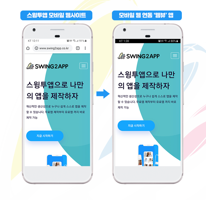 스윙투앱 홈페이지(웹사이트) 웹링크를 앱에 그대로 적용해서 제작된 푸시버전 앱입니다.