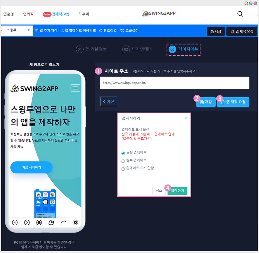 *웹뷰앱 제작방법은 스윙투앱 앱제작 V2로 안내드립니다. 앱제작 V1도 제작방법은 동일하기 때문에 기존 앱제작을 이용하셔도 됩니다.