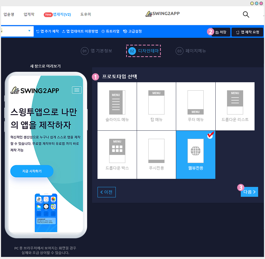 1)프로토타입 선택: ‘웹뷰전용’ 선택