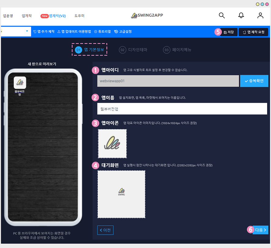 스윙 홈페이지 로그인 후 [앱제작 페이지] 1단계 앱 기본정보