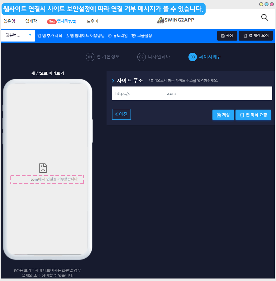 간혹 웹뷰앱, 푸시앱 제작하면서 웹사이트주소를 입력하고 저장버튼을 누르면 웹 미리보기 화면에서 ‘ 연결을 거부했습니다’ 라는 메시지가 뜨는 것을 확인할 수 있는데요.