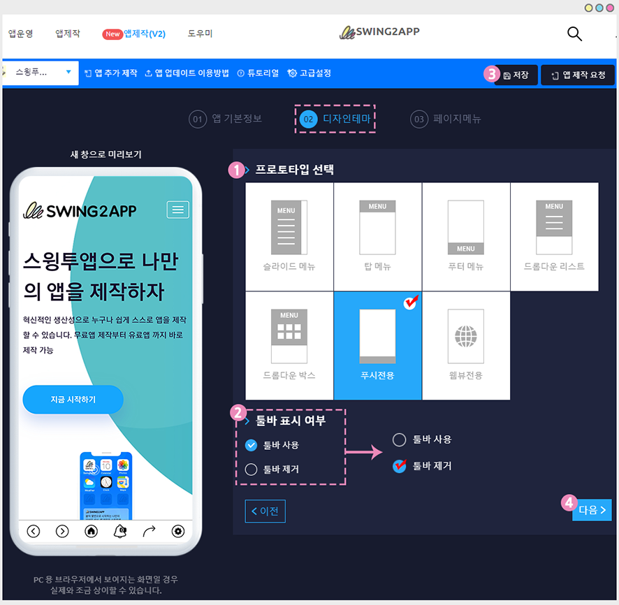 푸시 앱제작 과정은 모두 동일하구요. 디자인테마 단계에서 푸시 툴바 사용여부를 체크할 수 있습니다.