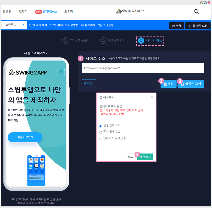 스윙 홈페이지 로그인 후 [앱제작 페이지] 1단계 앱 기본정보