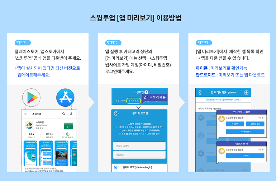 스윙투앱 공식앱 – [앱 미리보기]에서 제작한 앱을 다운받아 확인해주세요.
