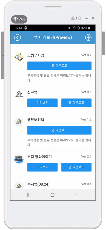 제작 완료된 앱은 스윙투앱 공식앱 [앱미리보기]를 이용하거나 메일로 발송된 APK파일을 안드로이드 폰에서 다운받아 확인할 수 있어요.