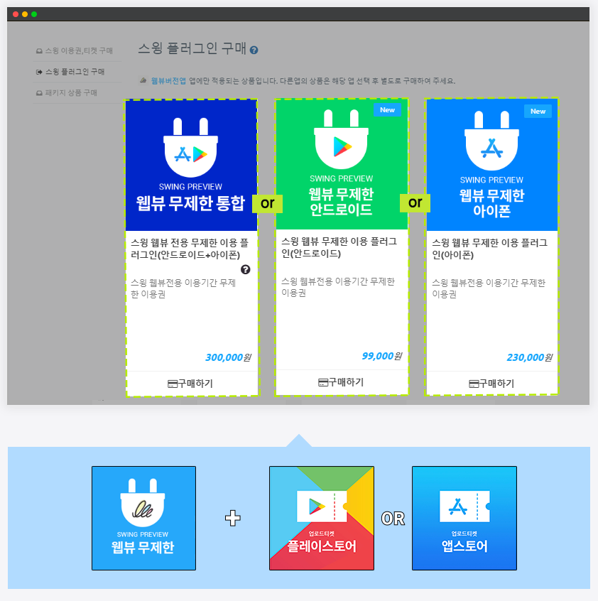 ▶ 스윙 기본형 이용권(1개월) 33,000원 +플레이스토어 업로드티켓 10,000원 +앱스토어 업로드 티켓 20,000원