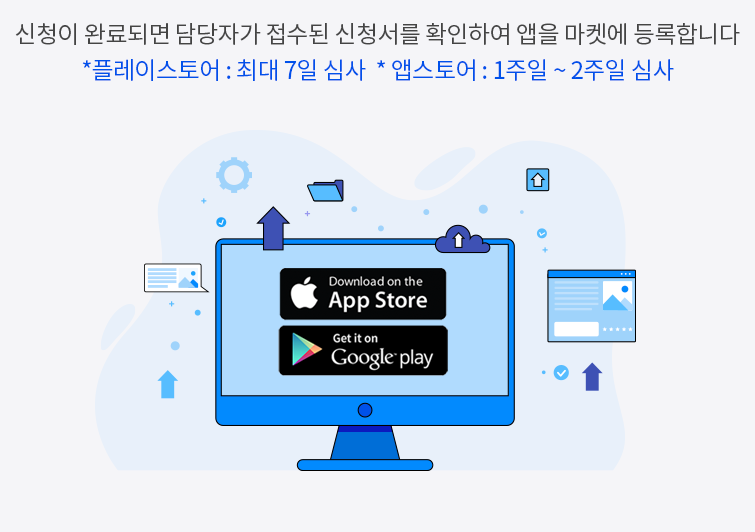 이용권 등 모든 상품 구매 후 플레이스토어, 앱스토어 업로드 신청 해주시면 저희가 대행하여 고객님 앱을 스토어에 올려드립니다.