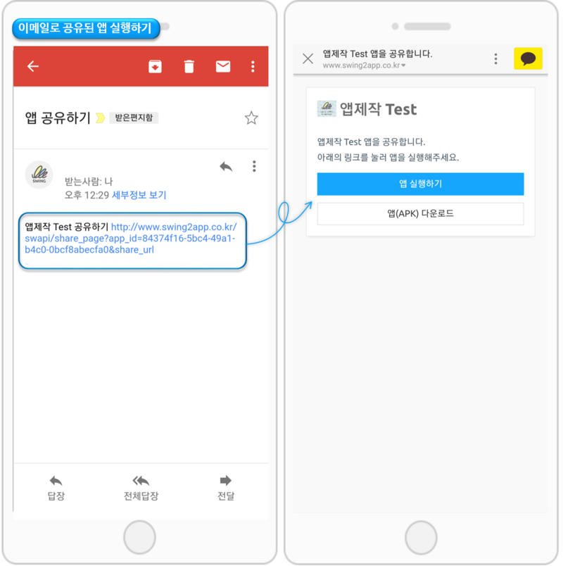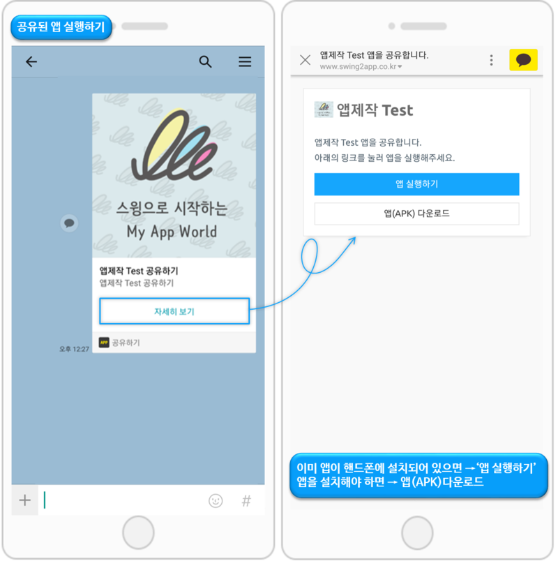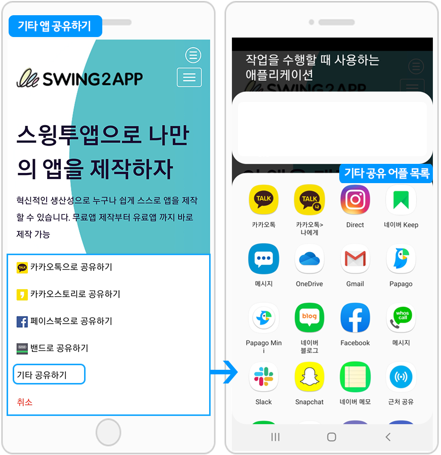 앱 공유는 스윙투앱으로 제작한 앱을 다양한 어플리케이션으로 공유할 수 있는 기능입니다.