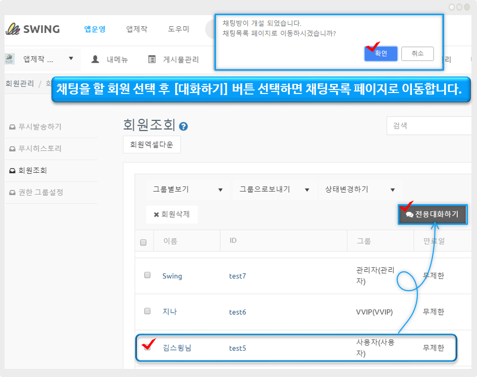 관리자는 스윙 웹(앱운영페이지)에서 제공하는 회원조회 메뉴에서 회원을 선택하여 대화를 할 수 있습니다.