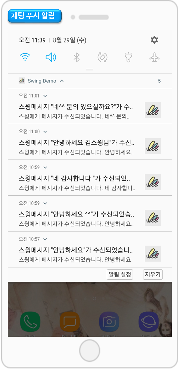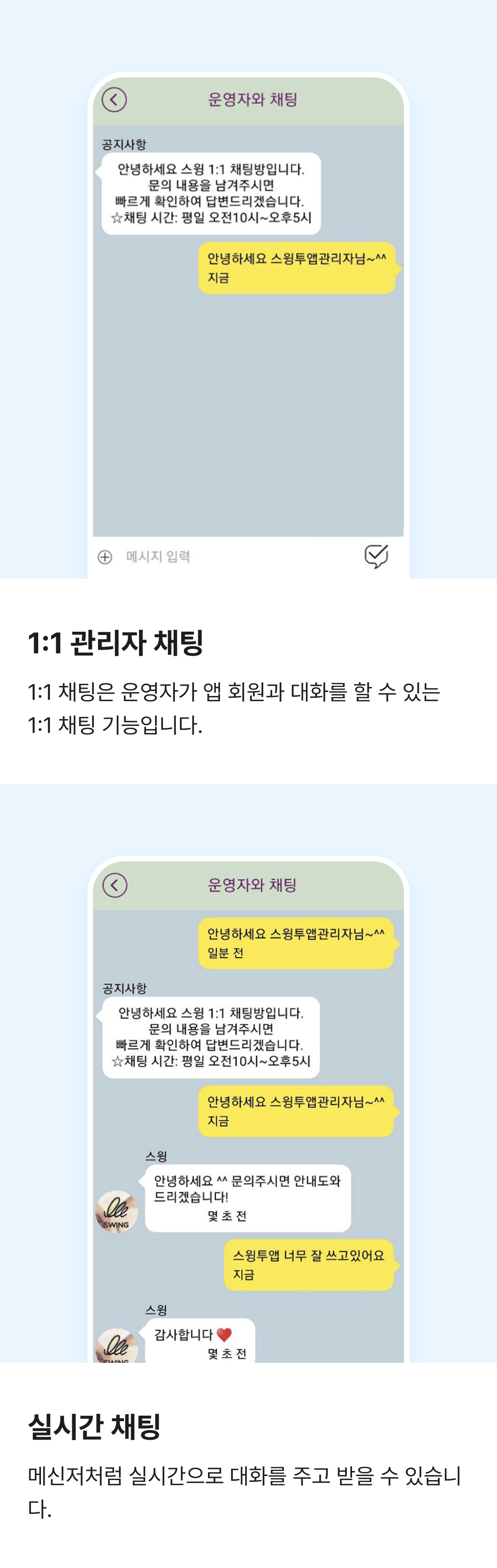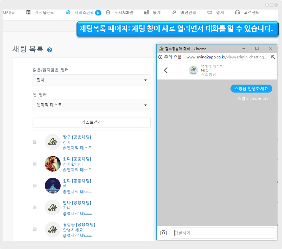 관리자 채팅 기능은 앱제작페이지의 – 스윙페이지에서 제공하고 있습니다. 앱에 채팅방을 적용해주세요!