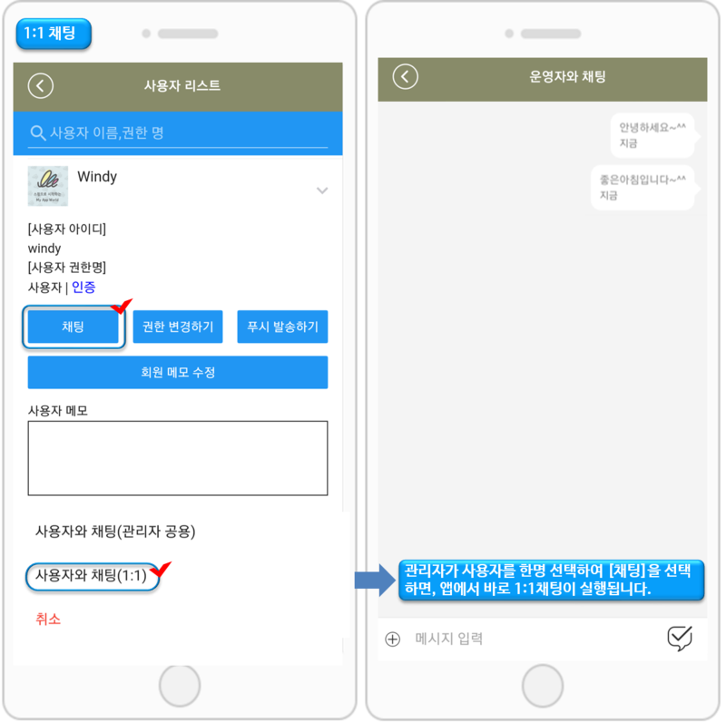 *앱 이용시: [설정- 앱관리자 메뉴] 로그인 후 [사용자관리]에서 원하는 사용자 선택 후 채팅