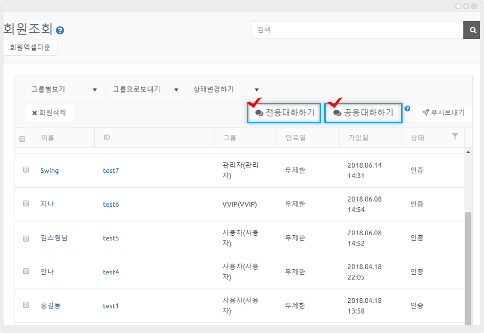 회원조회 페이지에 보시면 [전용대화하기], [공용대화하기] 버튼을 확인할 수 있습니다.