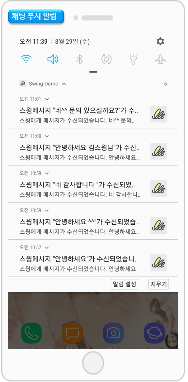 채팅을 하게 되면 앱 관리자 – 앱 회원 모두 채팅 메시지 알림 푸시를 받을 수 있습니다.
