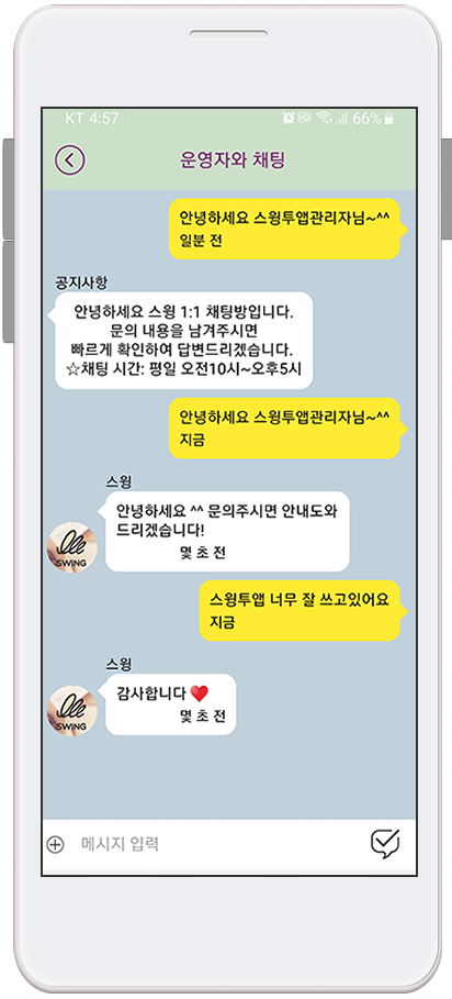 관리자는 웹(스윙 홈페이지)에서 채팅을 할 수도 있고, 앱에서도 이용할 수 있어요.