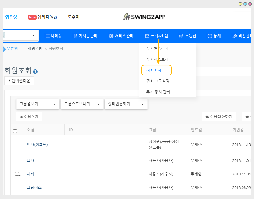 스윙 홈페이지 앱운영페이지 → 푸시&회원 → 회원조회 메뉴로 이동합니다.