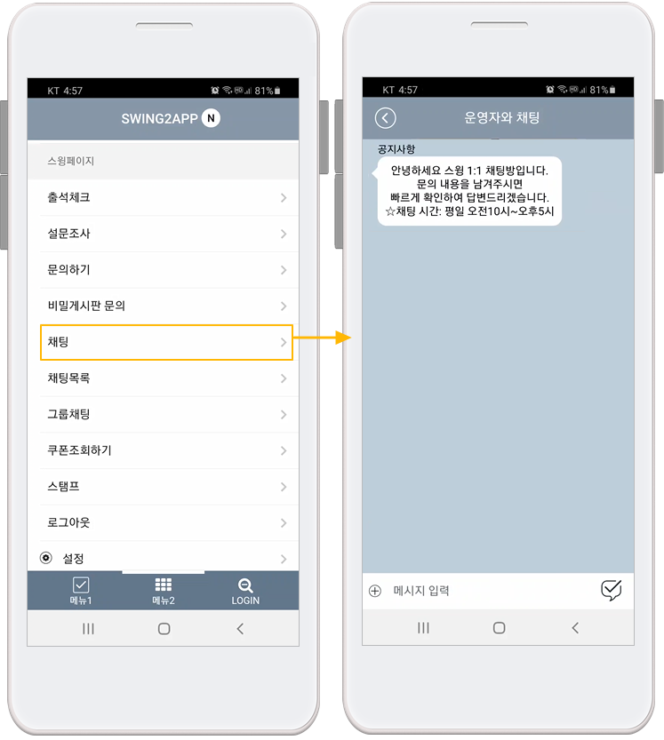 2. 운영자와 채팅하기 메뉴(1:1 채팅)는 *앱제작 페이지→ 페이지메뉴 →스윙페이지에서 [관리자 채팅] 으로 적용해주시기 바랍니다.
