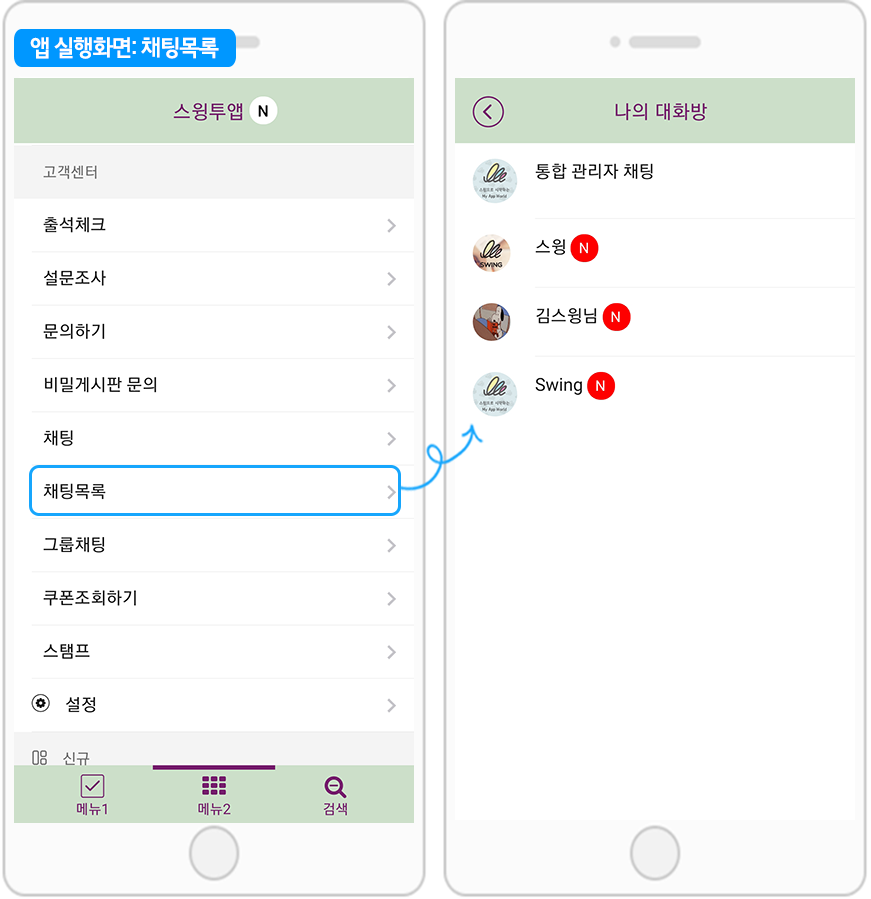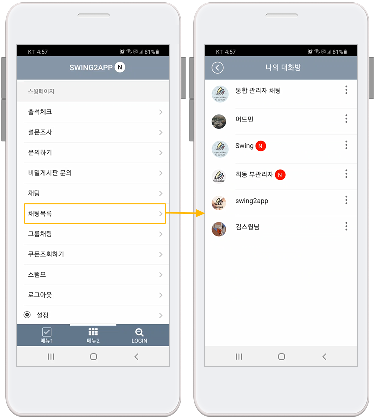 *채팅목록 메뉴 역시 스윙페이지에서 이용 가능합니다.