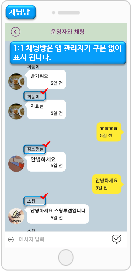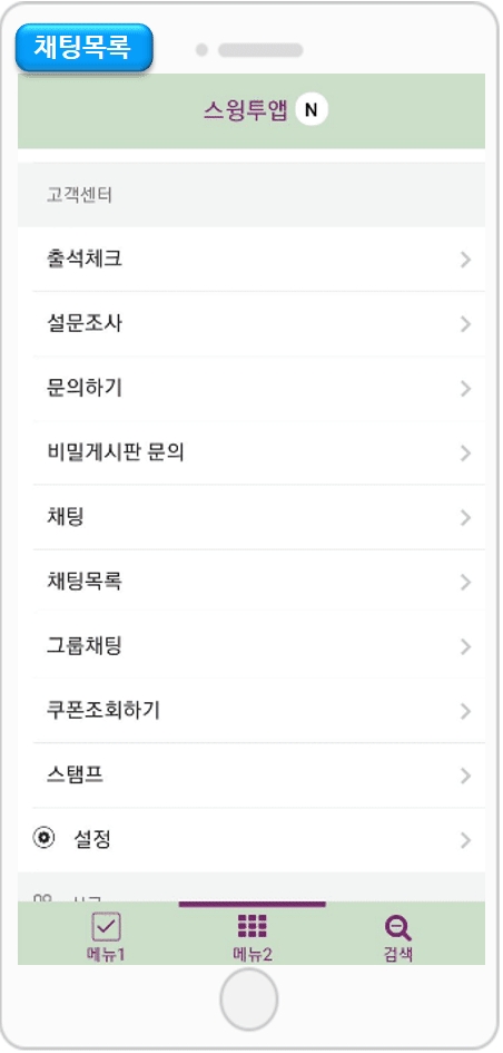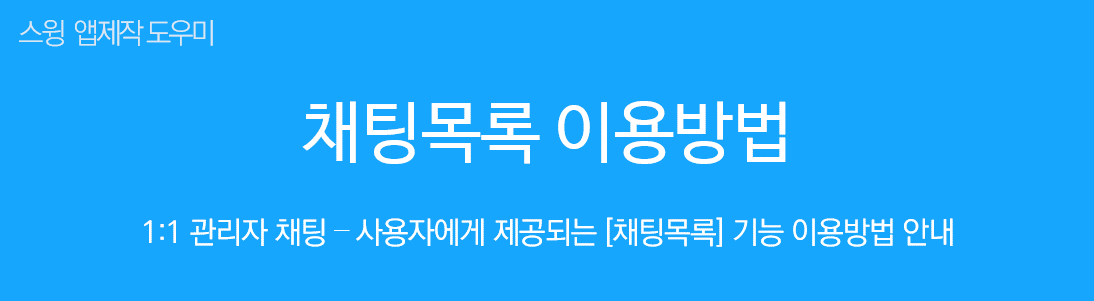 *2019.3.8 이전에 제작한 앱은 [채팅목록] 메뉴가 스윙페이지에서 보이지 않습니다.반드시 업데이트 후 이용해주세요.