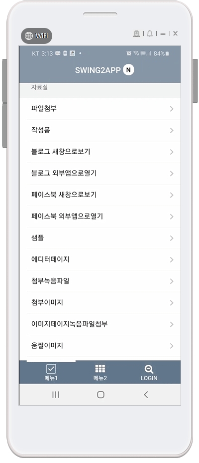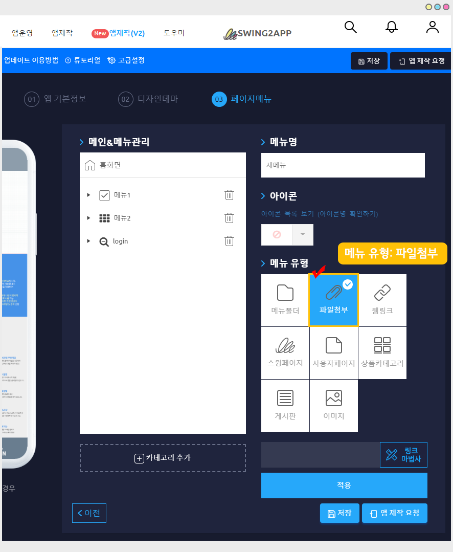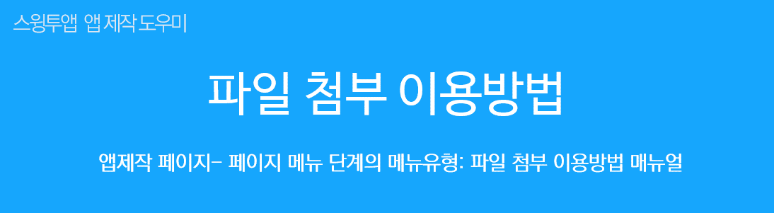 파일첨부는 앱제작 페이지 – 3단계 페이지메뉴 – 메뉴 유형에서 [파일 첨부] 기능을 이용할 수 있습니다.