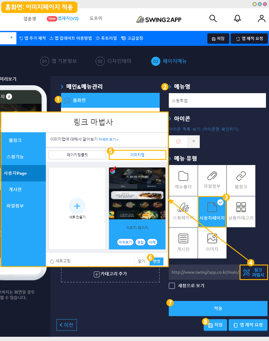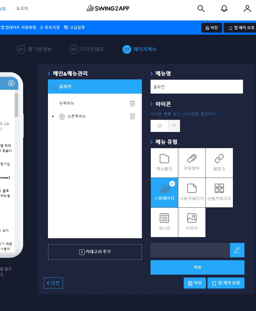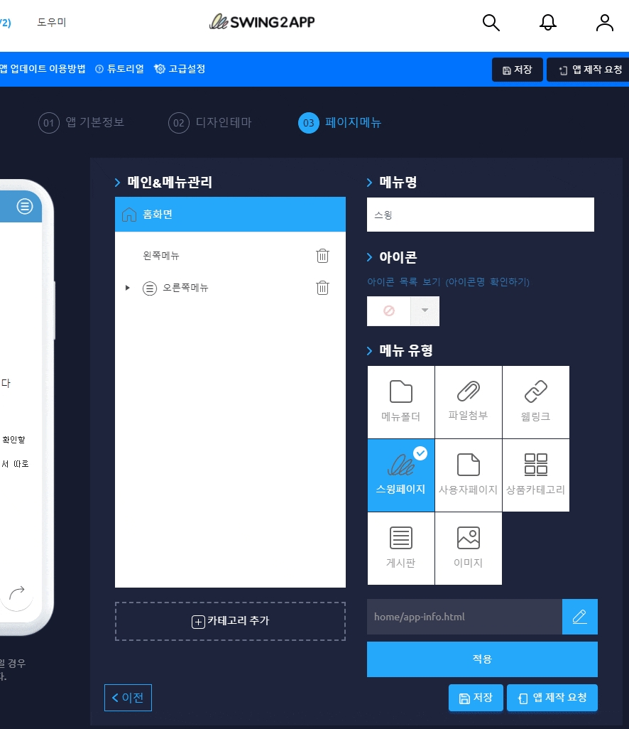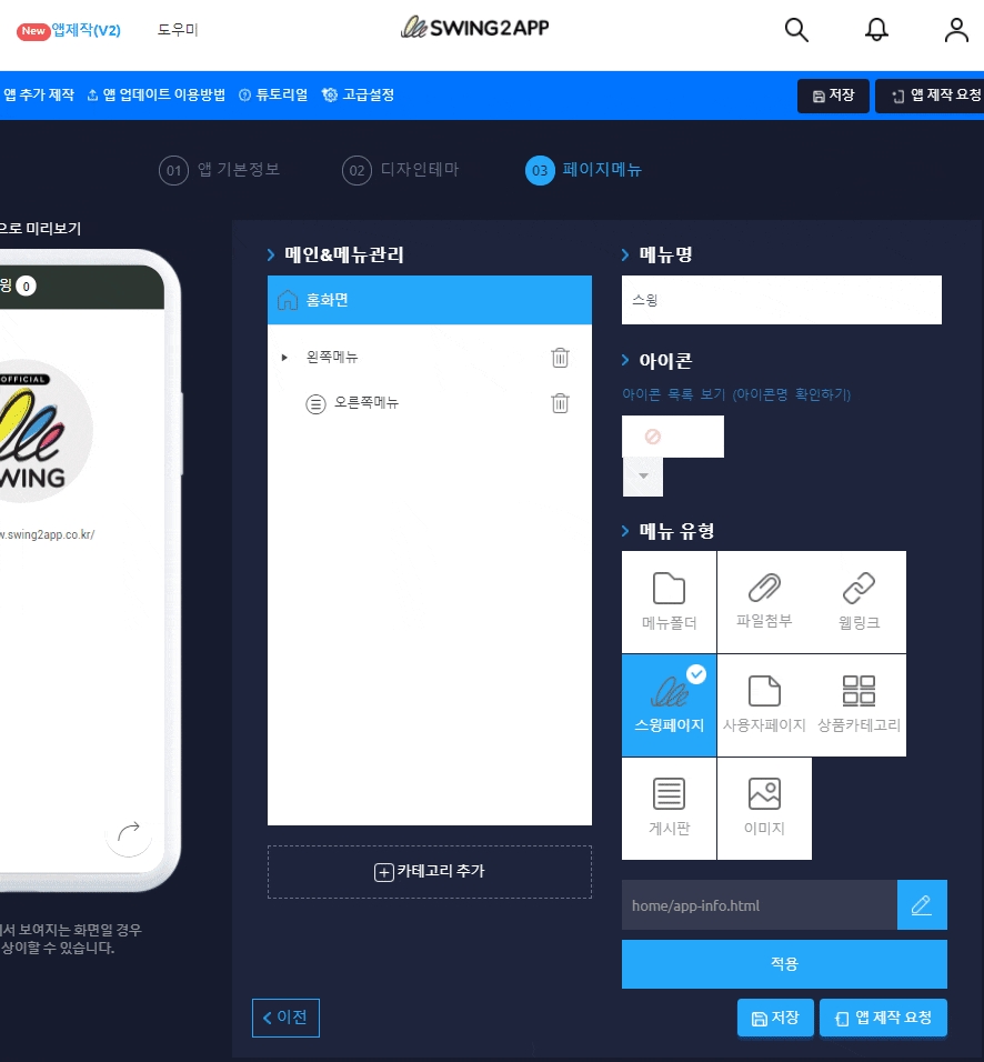 홈화면 제작은 스윙 앱제작 페이지 → 페이지 메뉴 → 메인&메뉴관리 → 홈화면에서 적용할 수 있습니다.