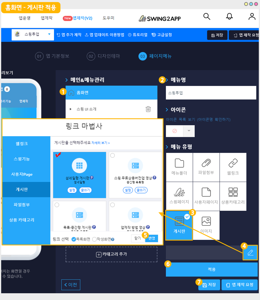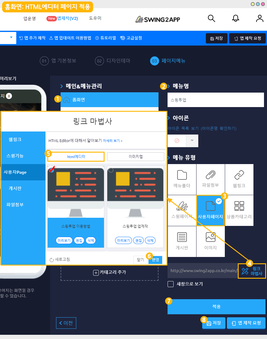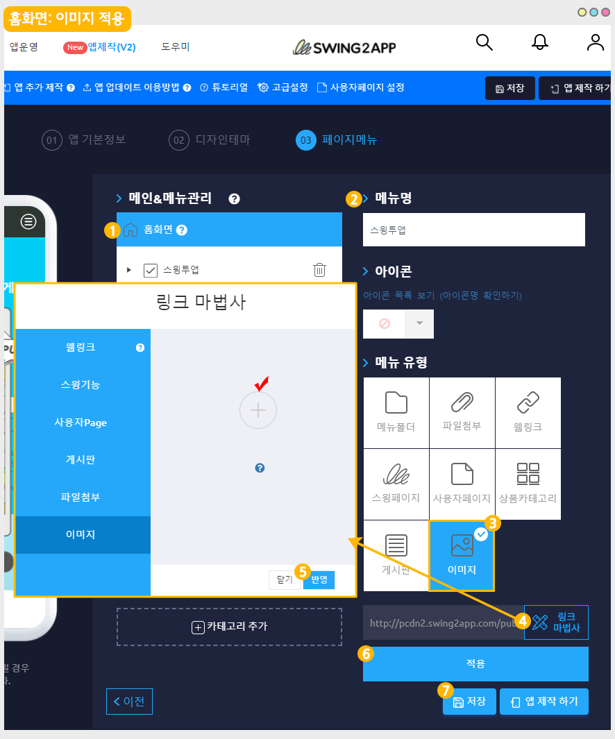 홈화면 제작은 스윙 앱제작 페이지 → 페이지 메뉴 → 메인&메뉴관리 → 홈화면에서 적용할 수 있습니다.